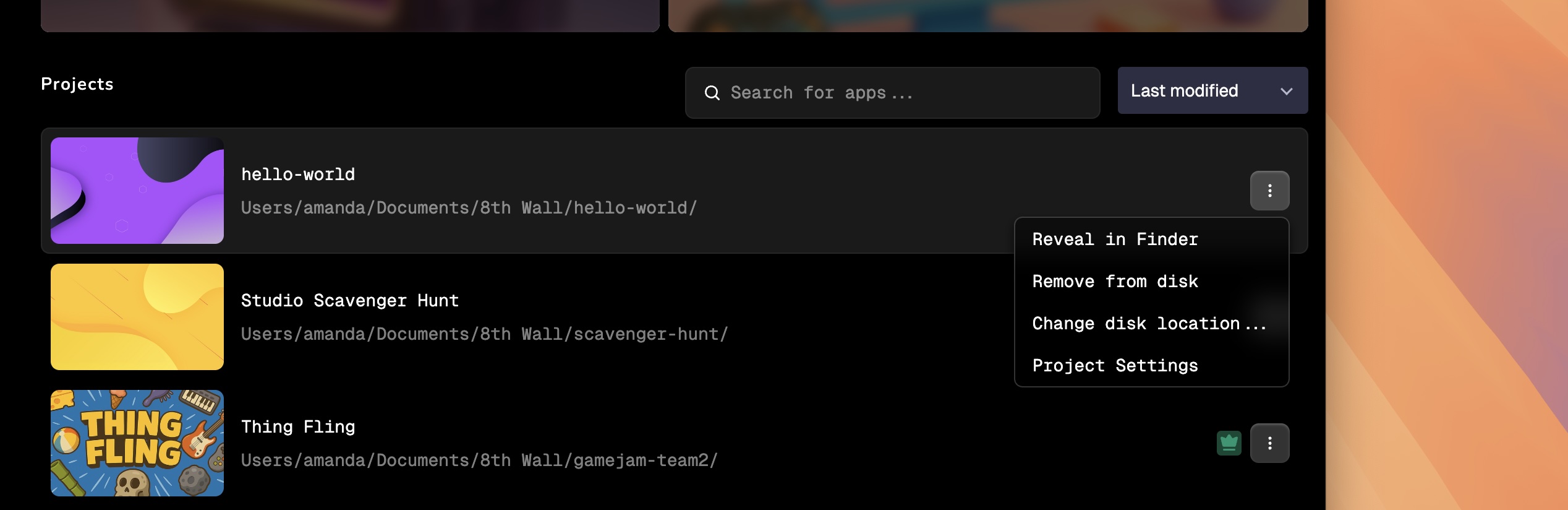 Wenn Sie ein Projekt zum ersten Mal erstellen oder öffnen, wird eine lokale Version des Projekts auf Ihrem Rechner unter ~/Documents/8th Wall/ hinzugefügt. Standardmäßig wird der 8th Wall-Ordner in Ihrem Dokumente-Ordner erstellt, aber Sie können dies ändern, indem Sie den 8th Wall-Ordner an einen anderen Ort verschieben.