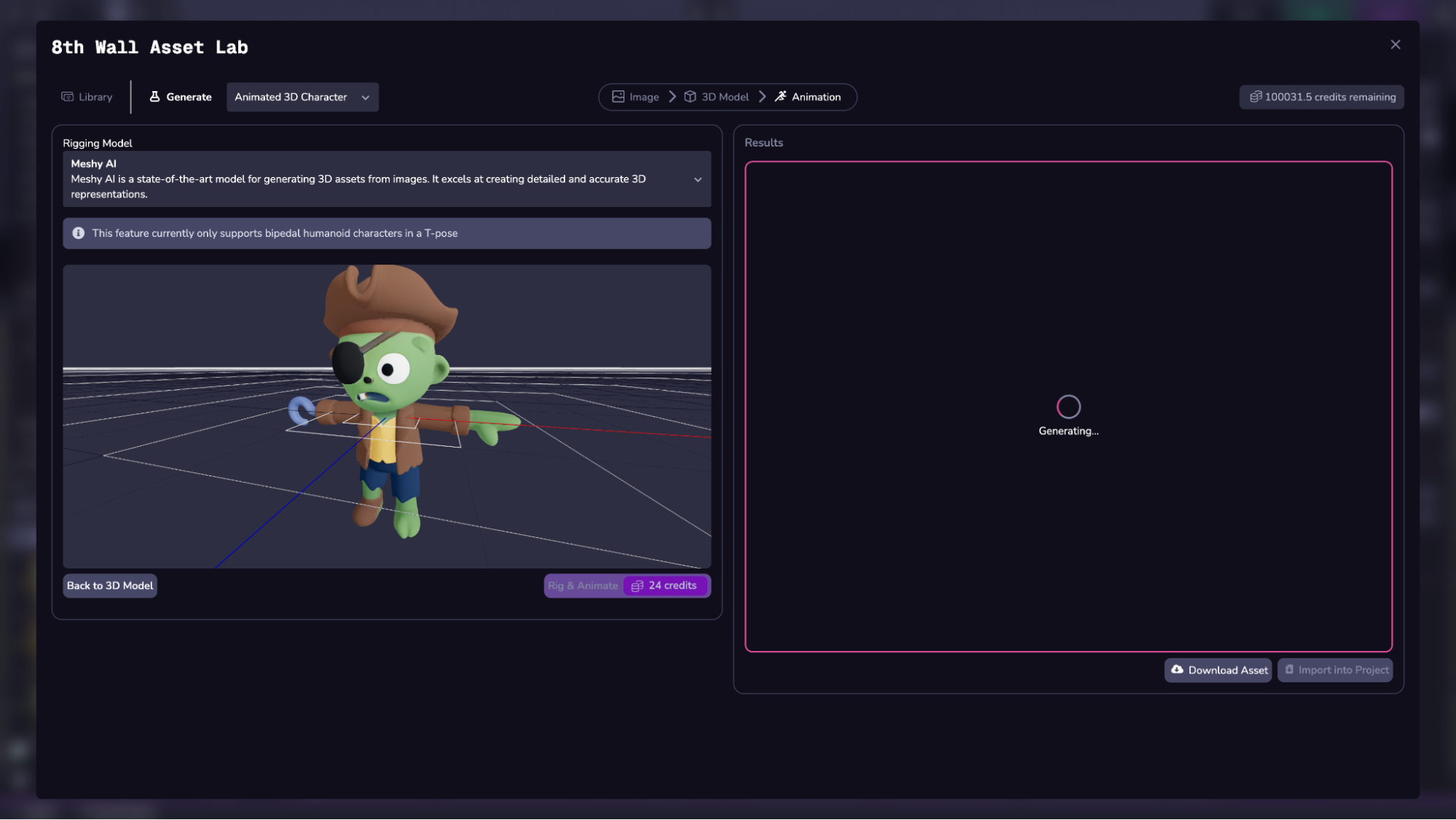 Unterstützt derzeit Rigging über Meshy. Die Eingabe muss ein zweibeiniger Humanoid mit klar definierten Gliedmaßen sein.
