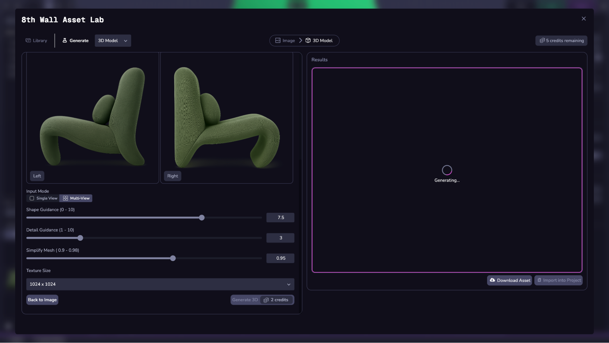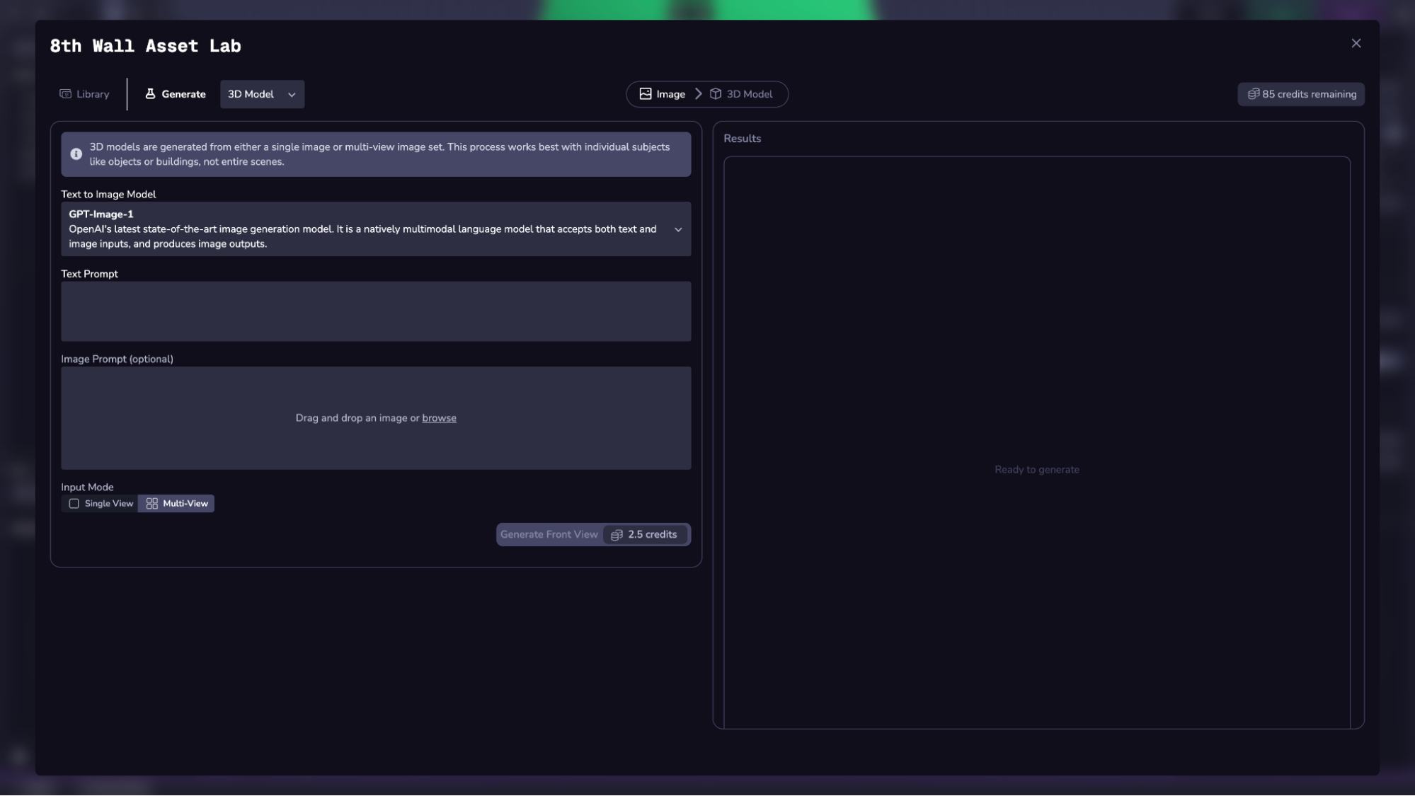 Wenn Sie Multi-View wählen, erzeugen Sie zunächst eine Ansicht der "Vorderseite" Ihres Objekts. Wenn Sie mit dem Ergebnis zufrieden sind, können Sie anschließend die Ansichten "rechts", "links" und "hinten" desselben Objekts über die Schaltfläche "Mehrfachansicht erzeugen" generieren. Für diesen Schritt ist die Verwendung von GPT-image-1 erforderlich.