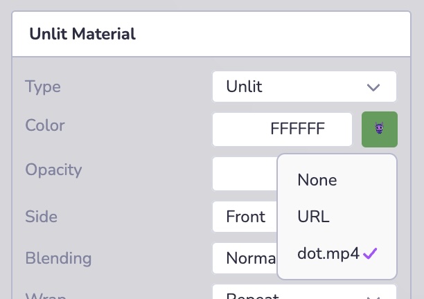 Pour appliquer une texture vidéo à une entité, sélectionnez une vidéo de vos ressources dans le menu déroulant de la carte de texture.
