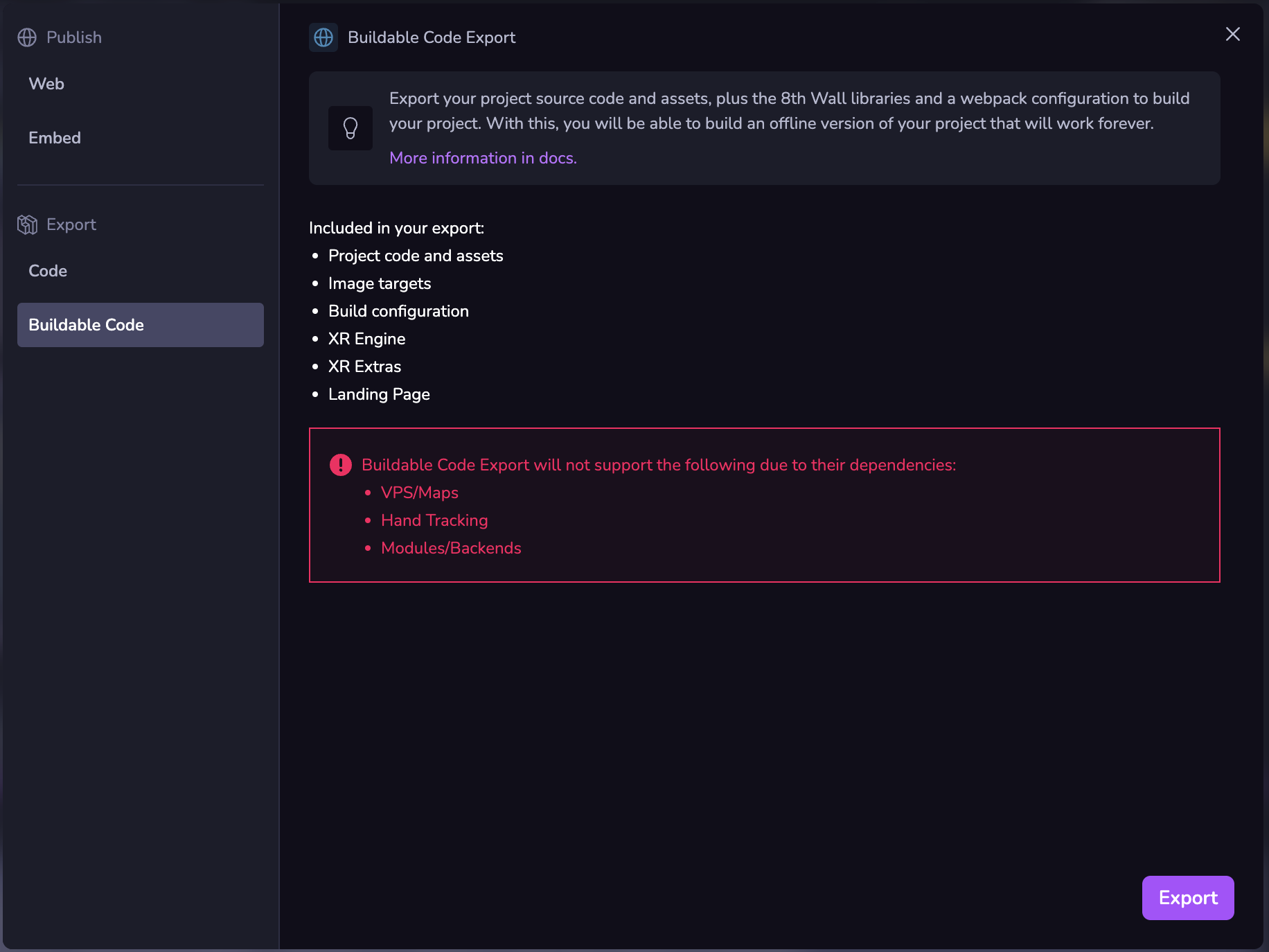 ビルド可能なコードエクスポートには、プロジェクトのコードとアセット、イメージターゲット、ビルド設定、XR Engine、XRExtras、ランディングページなど、プロジェクトのオフラインバージョンのビルドと実行に必要なすべてが含まれています。